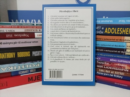 1. Cili është investimi më i sigurt në jetë.2. Çfarë sjellin fjalët negative.3. Cili është potenciali më i fuqishëm që ne kemi.4. Ku ta gjejmë motivin dhe si të vetmotivohemi.5. Tri sekrete pse njerëzit nuk arrijnë të bëhen të pasur.6. Si te fokusohesh në atë që do që ajo të realizohet.7. Si ta nisësh një biznes me kapital 0.8. A janë idetë e të tjerëve një kapital për ne.9. Si të krijoni efektin e fituesit ndaj kundërshtarit para se të fillojë ndeshja.10. Si të menaxhojmë kohën në minimum dhe maksimum të saj.11. Menaxhimi i kapitaleve të padukshme.12. Si të prezantojmë veten te të tjerët.13. Çfarë duhet të kërkosh nga një sipërmarrës ose punëdhënës kur kërkon një vend pune.14. Mendo për gjëra të mëdha se ato kushtojnë më pak se gjërat e vogla.15. Nga se vjen suksesi dhe cilët janë faktorët që e sjellin atë.16. Si të jesh ndikues dhe jo i ndikuar.17. Si të planifikosh 10 vizione për veten tënde për një periudhë 10 vjeçare.- Autori: Muhamet Bizhga